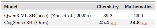 To further verify the generalization capability of CogSense-8B, we extend our evaluation to out-of-domain scenarios using the Chemistry and Math subsets of the EMMA benchmark, with both the question and the options are images.