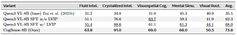 We evaluate performance across three variants: the standard SFT without LVIP, SFT with LVIP, and CogSense-8B that combines LVIP-supervised SFT and RL. These gains indicate that RL plays a vital role in refining the model's reasoning logic based on the supersensing obtained by LVIP.