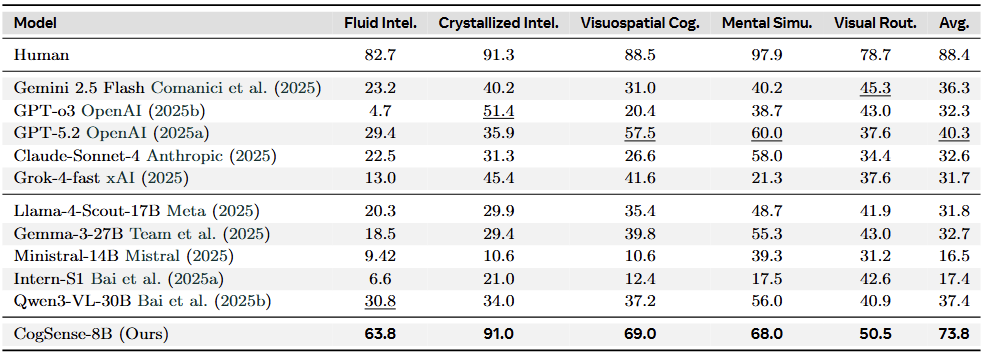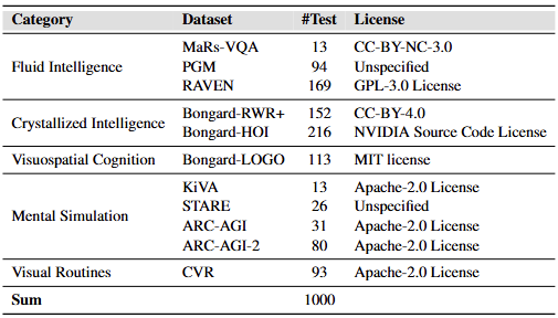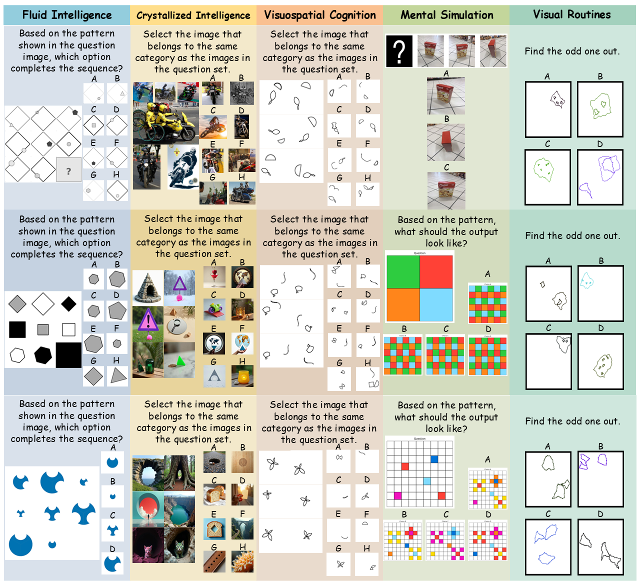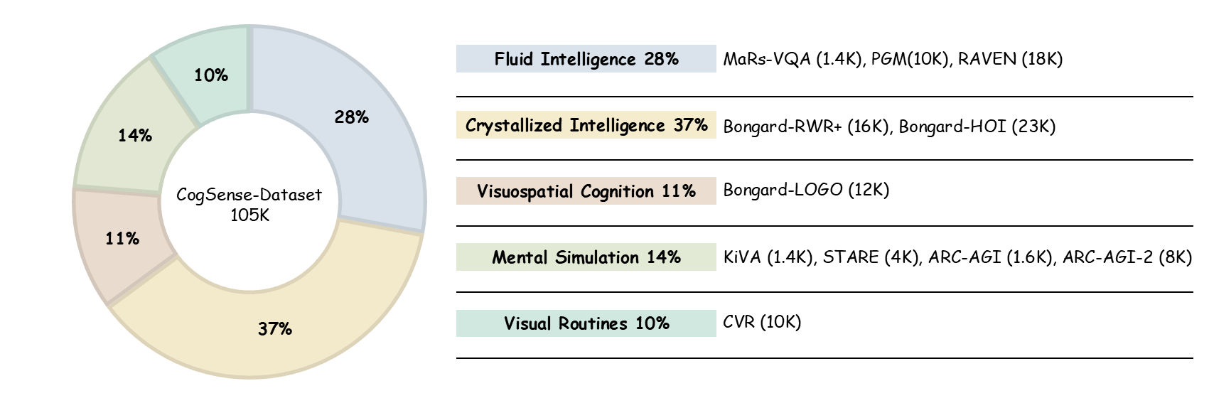 - CogSense-Bench. We introduce CogSense-Bench, a comprehensive benchmark spanning five cognitive dimensions, fluid intelligence, crystallized intelligence, visuospatial cognition, mental simulation, and visual routines, providing a systematic testbed for evaluating visual cognition beyond perceptual recognition and supporting future research in this direction.